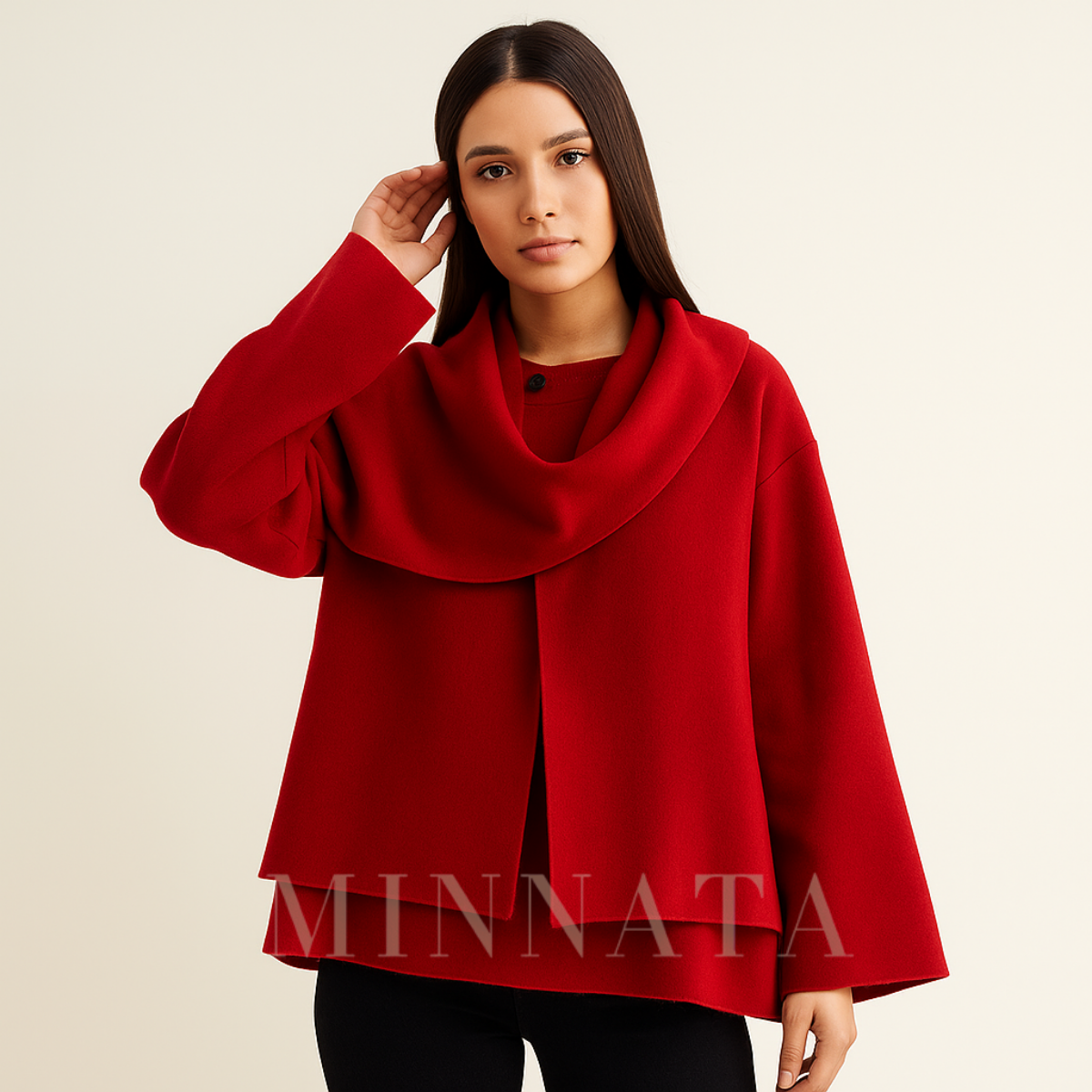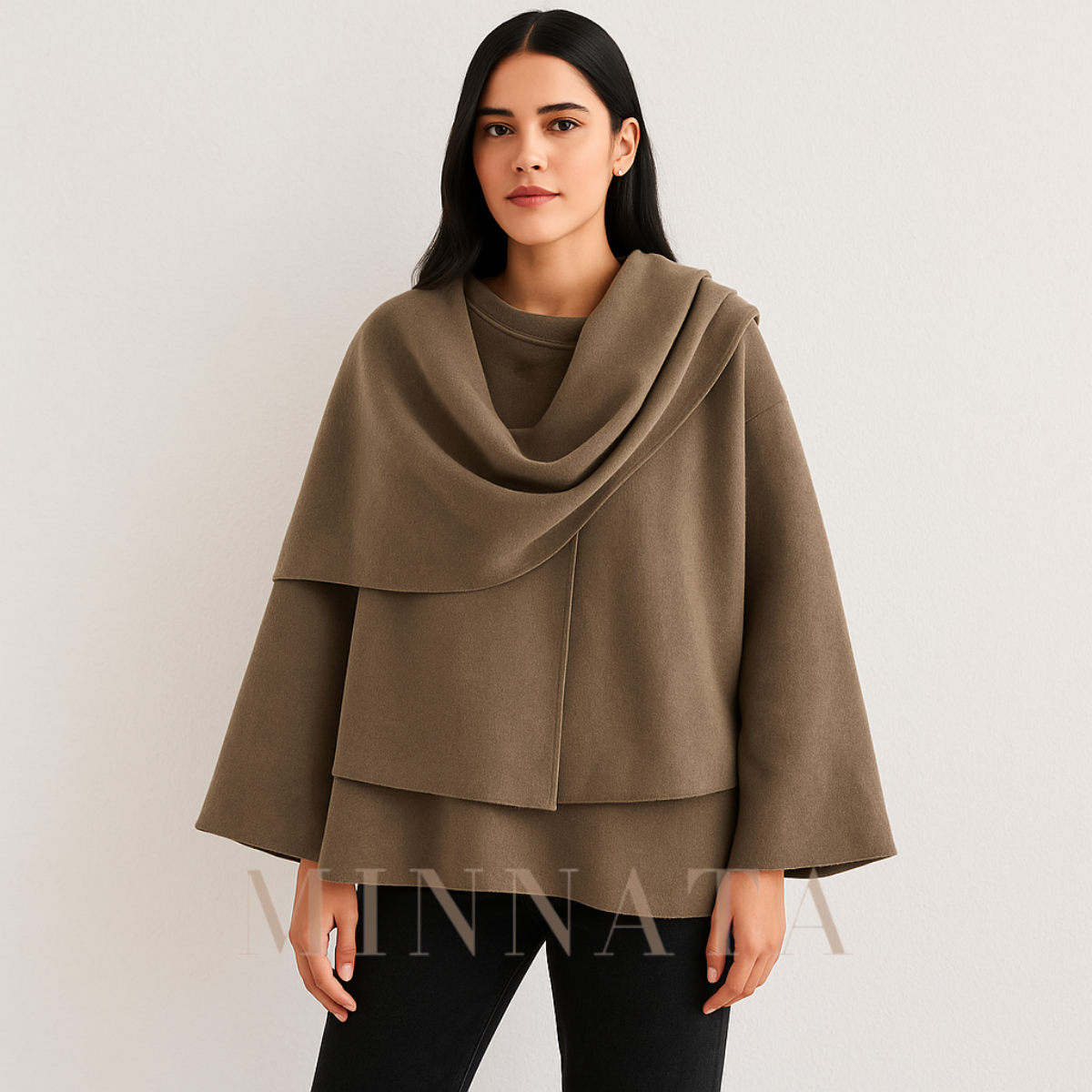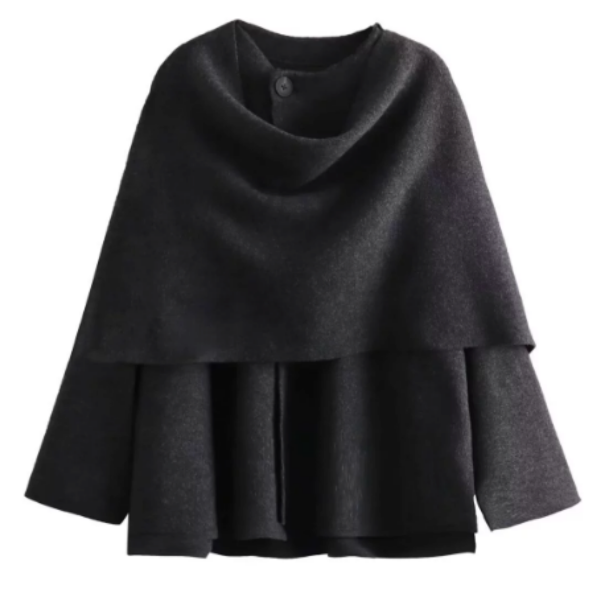 Esta capa redefine la elegancia invernal con su corte amplio y silueta minimalista. Su diseño oversize permite combinarla sobre múltiples capas sin perder sofisticación, mientras el cuello-bufanda asimétrico aporta un toque contemporáneo y acogedor. Perfecta para transitar del día a la noche, complementa cualquier outfit urbano.