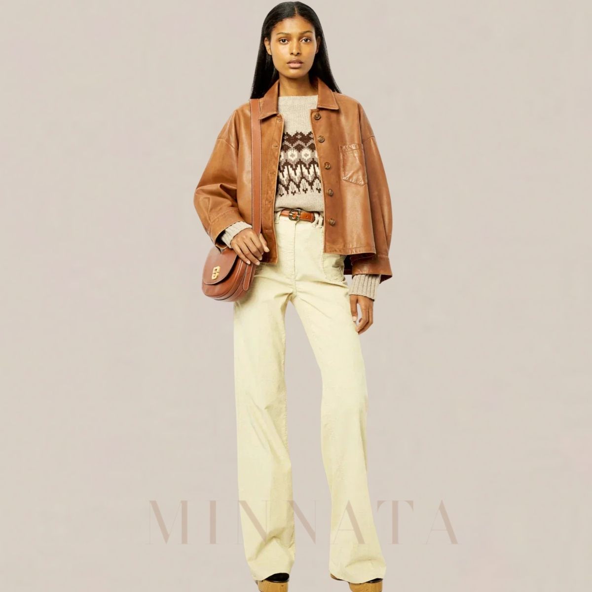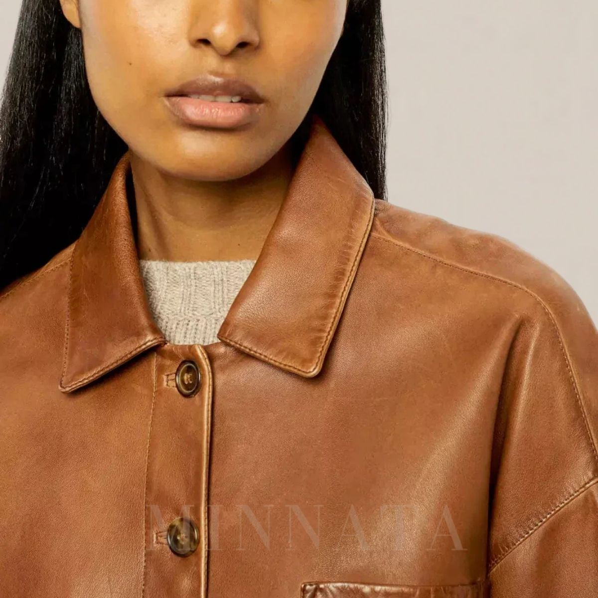 Nuestra chaqueta de piel lisa combina lo mejor del minimalismo con la estructura de una silueta refinada. El cuello tipo camisa y los botones redondos aportan equilibrio entre lo clásico y lo contemporáneo, mientras que el corte recto y relajado brinda comodidad sin perder estilo.