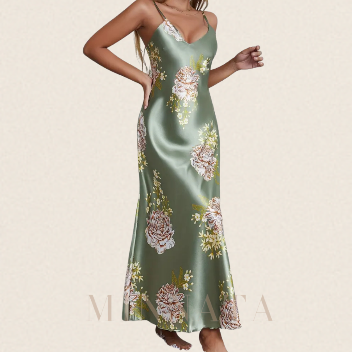 Camisón ligero, sin espalda, con delicados tirantes de spaghetti y un elegante estampado floral.